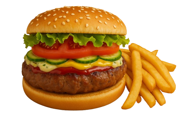 Beef burger 150g, tomato, lettuce, mustard, ketchup, cucumber & mayonnaise salad. Served with fried potatoes.