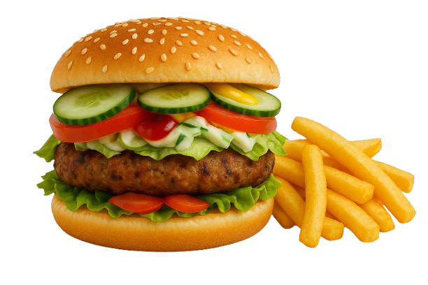 Vegetable burger, tomato, cucumber & mayonnaise salad, mustard, ketchup. Served with fried potatoes.